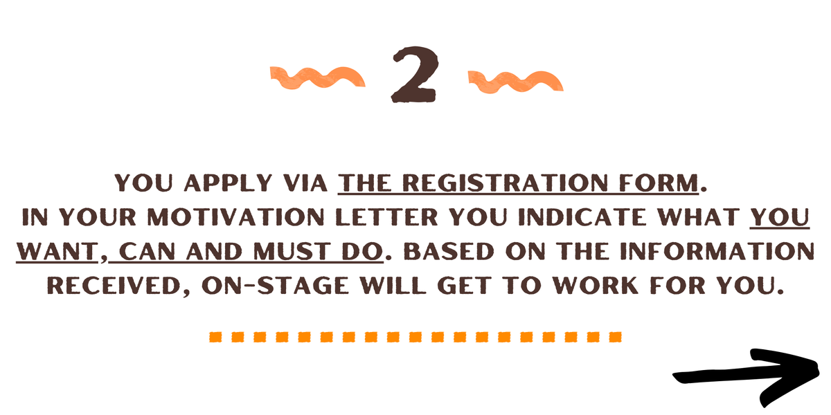 2. You register via the registration form. In your motivation letter you indicate what you want, can and must do. Based on the information received, On-Stage will get to work for you.